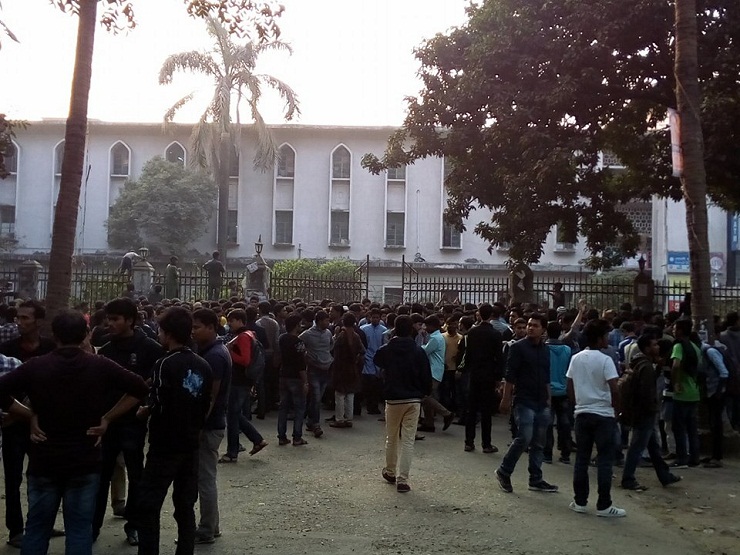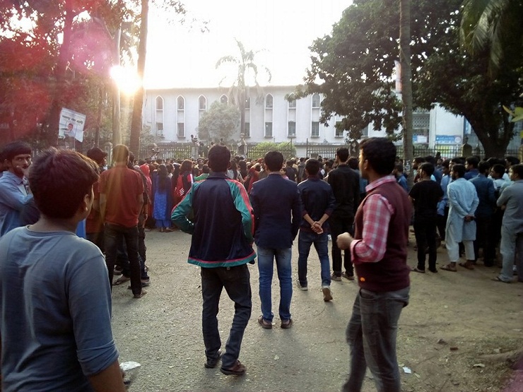 ১১টার দিকে অপরাজেয় বাংলার পাদদেশে জড়ো হন শ দুয়েক শিক্ষার্থী। পরে তারা উপাচার্য কার্যালয়ের সামনে যান। কিন্তু কার্যালয়ের কর্মীরা ভেতর থেকে লোহার ফটকে তালা ঝুলিয়ে দেন। এতে ক্ষুব্ধ হয়ে শিক্ষার্থীরা ফটকে ধাক্কা দিতে থাকেন। একপর্যায়ে সেটি ভেঙে যায়। এরপর ভেতরে ঢুকে কার্যালয়ের সামনে অবস্থান নেন তারা।