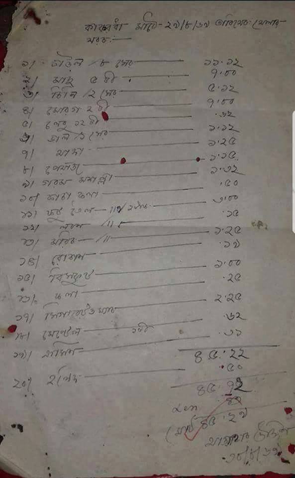একটি পারিবারিক আয়োজনের জন্য বেশ কিছু বাজার করতে হয়েছে ওই ফর্দ তৈরি করা ব্যক্তির। আর এই সূত্রে তখনকার পণ্যমূল্য সম্পর্কে একটি ধারণা পাওয়া যায়। এই ফর্দটি আজহার উদ্দিন নামের এক লোকের।