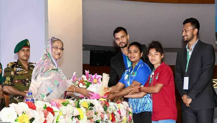 খেলোয়াড়দের মধ্যে যারা প্রধানমন্ত্রীকে ফুলেল শুভেচ্ছা জানিয়েছেন, তাদের দলে দুই জন নারী ক্রীড়াবিদ ছাড়াও ছিলেন মাশরাফি ও সাকিব।