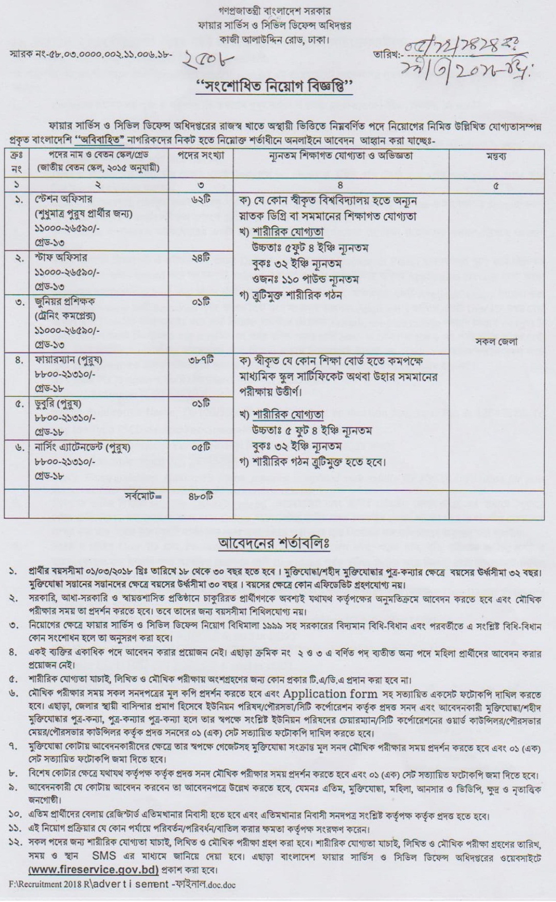 পদের নাম ও পদসংখ্যা: ফায়ারম্যান (পুরুষ) ৩৮৭টি, ডুবুরি (পুরুষ) ১টি, নার্সিং অ্যাটেনডেন্ট (পুরুষ) ৫টি।