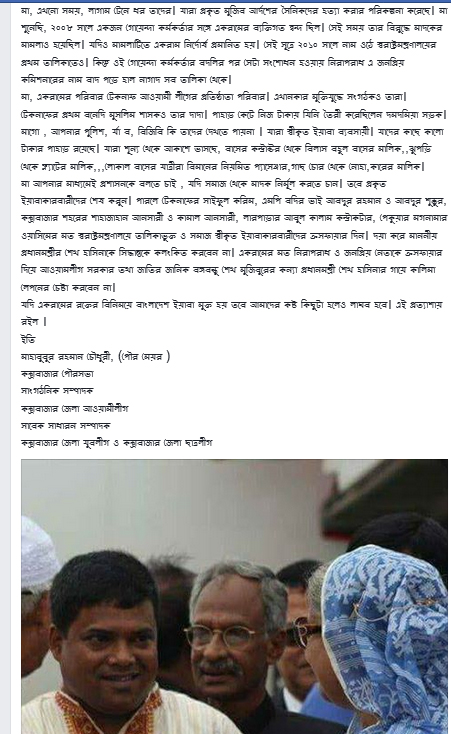 শেখ হাসিনাকে কক্সবাজারের মেয়র লেখেন, ‘মা, এখনও সময়, লাগাম টেনে ধরো তাদের। যারা প্রকৃত মুজিব আর্দশের সৈনিকদের হত্যা করার পরিকল্পনা করেছে।’