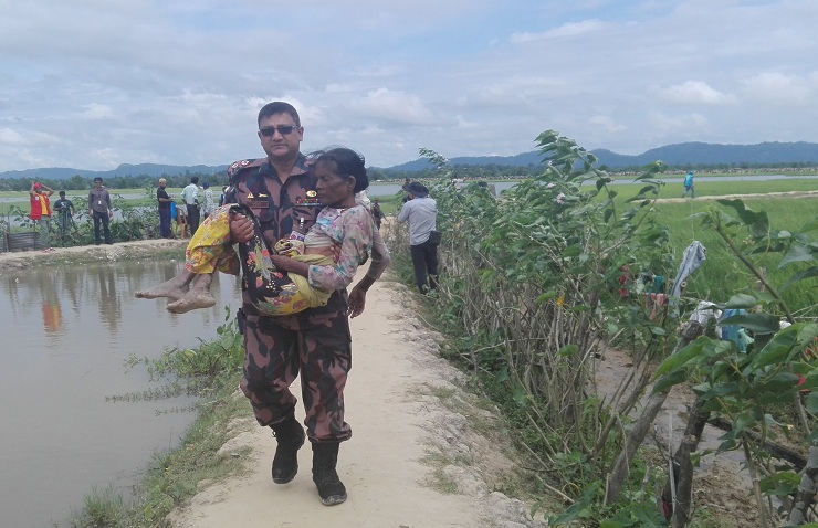 ৩৪ বিজিবির উপ-অধিনায়ক আশিকুর রহিম দুপুরে উখিয়ার পালংখালী আনজিমান সীমান্তে সাংবাদিকদের বলেন, বিজিবির পক্ষ থেকে মানবিক সব ধরনের সহায়তা দেয়া হচ্ছে। বিজিবির একটি বিশেষ টিম কাজ করছে। রোহিঙ্গারা যাতে বিস্ফোরক জাতীয় কোনো দ্রব্য বহন করে নিয়ে যেতে না পারে, সেদিকে সতর্ক দৃষ্টি রাখা হচ্ছে। দীর্ঘ পথ অতিক্রম করে আসা এসব রোহিঙ্গাকে ক্যাম্পে পাঠিয়ে দেওয়ার আগে পানি, শুকনো খাবার ও অন্যান্য সহায়তা করা হচ্ছে।