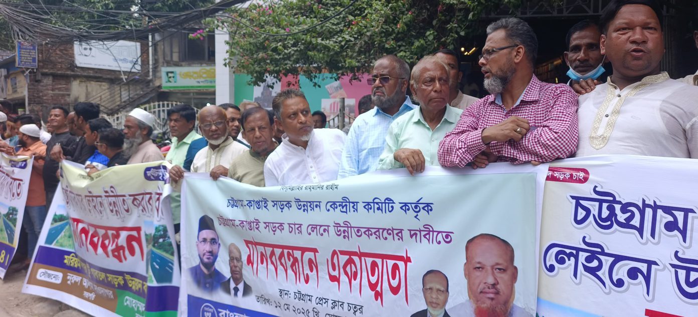 নেতৃবৃন্দসহ বিভিন্ন শ্রেণী পেশার মানুষ। আজ ১২ মে সোমবার সকাল ১১টায় নগরের চট্টগ্রাম প্রেস ক্লাব চত্ত্বরে আয়োজিত মানববন্ধনে বক্তারা বলেন, ১৯৬৩ সালে স্থাপিত চট্টগ্রাম কাপ্তাই মহাসড়ক দেশের অন্যতম আধুনিক সড়ক। একমাত্র কাপ্তাই সড়ক স্থাপনকালে গুরুত্ব বিবেচনায় এই সড়কের উভয় দিক ৩০/৪০ ফুট ভূমি অধিগ্রহণ করা হয়। কিন্তু দুঃখের বিষয়ে স্থাপনের ৫৫ বছর অতিবাহিত হলেও সড়কটি চার লেনে উন্নীত করা হয়নি। ভূমি অধিগ্রহণে কোটি কোটি টাকা নয় ছয় করা যাবে না বলে বিগত সরকার এই সড়কের উন্নয়ন করেনি। ভূমি অধিগ্রহণ করে চট্টগ্রাম রাঙামাটি চার লেনে উন্নীত করা হয়েছে। কিন্তু চট্টগ্রাম কাপ্তাই সড়কে ভূমি অধিগ্রহণ থাকা সত্ত্বেও সড়কটির উন্নয়ন করা হয়নি।