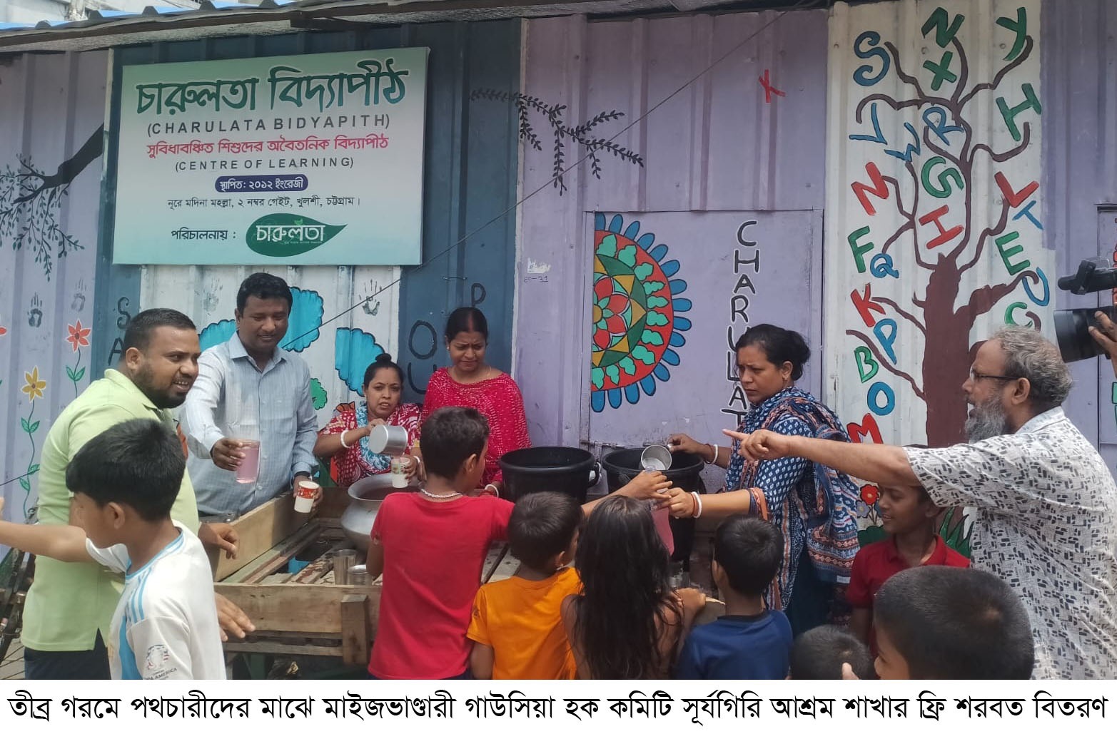 ষোলশহর পূনর্বাসন এলাকা, চারুলতা বিদ্যাপীঠের সামনে মাইজভাণ্ডারী গাউছিয়া হক কমিটি বাংলাদেশের ত্রাণ ও দূর্যোগ মোকাবেলা সেলের সহযোগিতায় গ্রীষ্মের প্রচণ্ড তীব্র তাপদাহে তৃষ্ণার্থ মানুষের মাঝে আজ ১৩ মে মঙ্গলবার সুপেয় শরবত বিতরণ করা হয়।